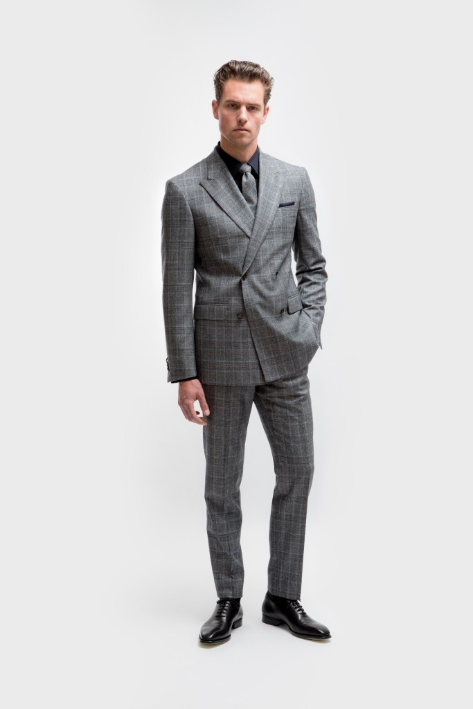 Prince of Wales plaid double breasted suit by Richard Fox.